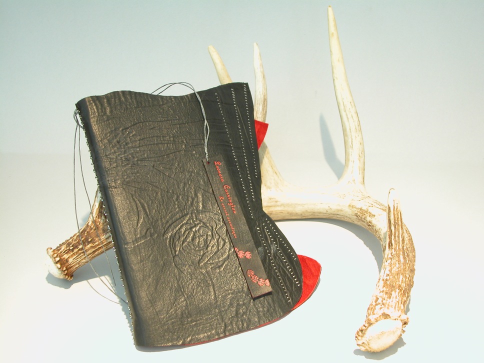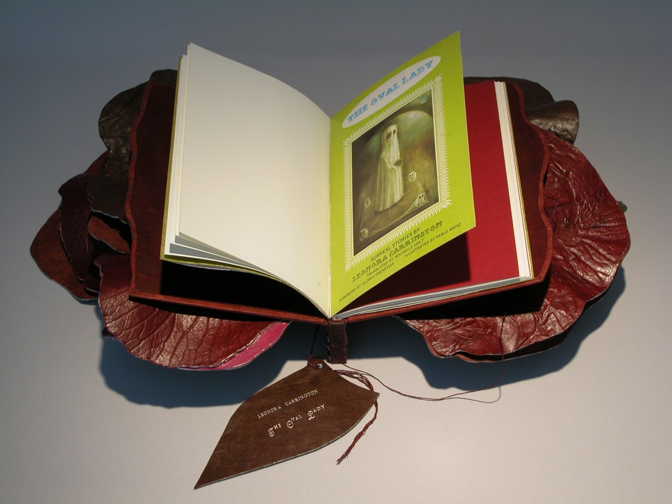 ANTECHAMBER is a series of bindings and book/objects that work with a selection of fiction by the English-born Surrealist painter and writer Leonora Carrington (1917-2011). The texts include first and second editions, including a rare edition of The Oval Lady (1975). The books are technical hybrids: hardcover hidden within softcover; Japanese sewn spines with articulated covers that are like tentacles, flower-fish, butterflies, and Carrington’s signature vegetable: the red cabbage.